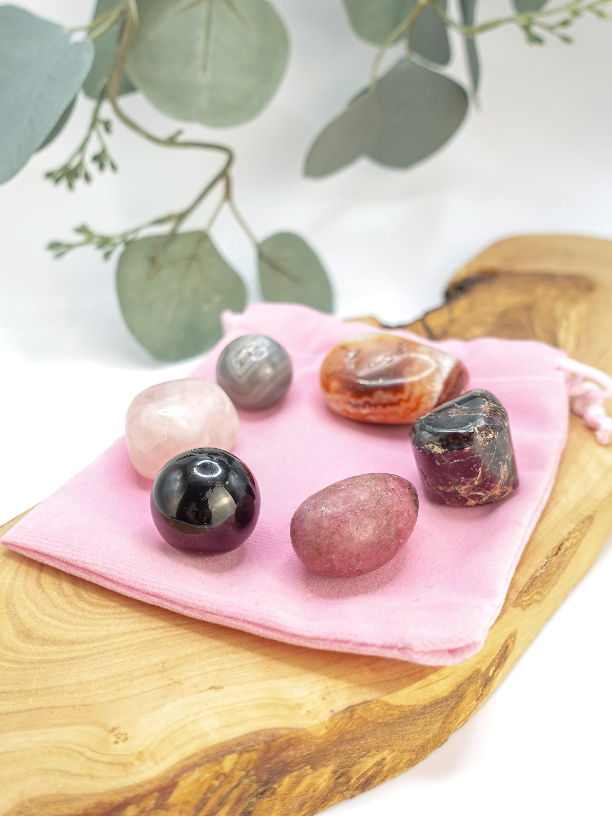 LOVE - Our Love bundle is the perfect pick-me up – good for self love, attracting romance, and emotional healing. Show yourself some well-deserved love today! Crystals: Rhodonite, Carnelian, Garnet, Rose Quartz, Rainbow Obsidian, and Agate