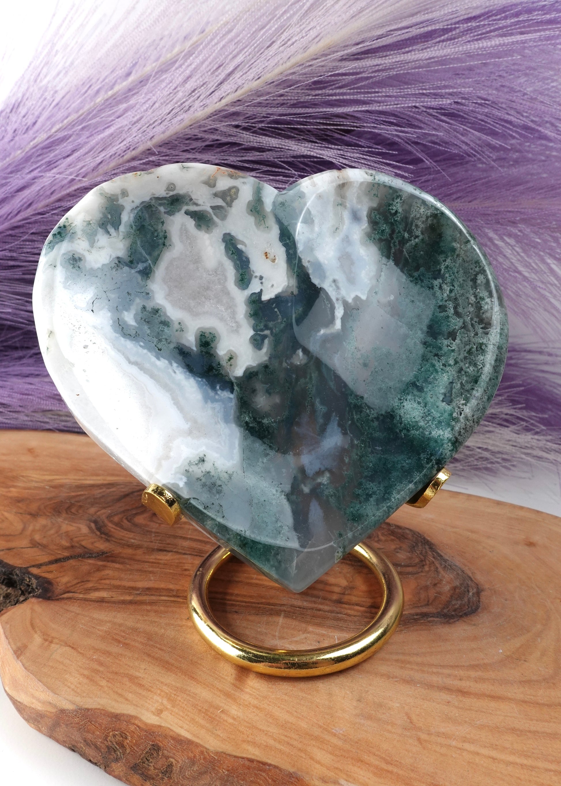 Bring a little love and nature’s charm to your space with the Moss Agate Heart Dish. This playful heart-shaped dish combines the calming greens and flickers of nature found in moss agate, perfect for holding your little treasures or simply brightening your day. Use it to keep your rings, keys, or small trinkets safe with a touch of natural whimsy.
