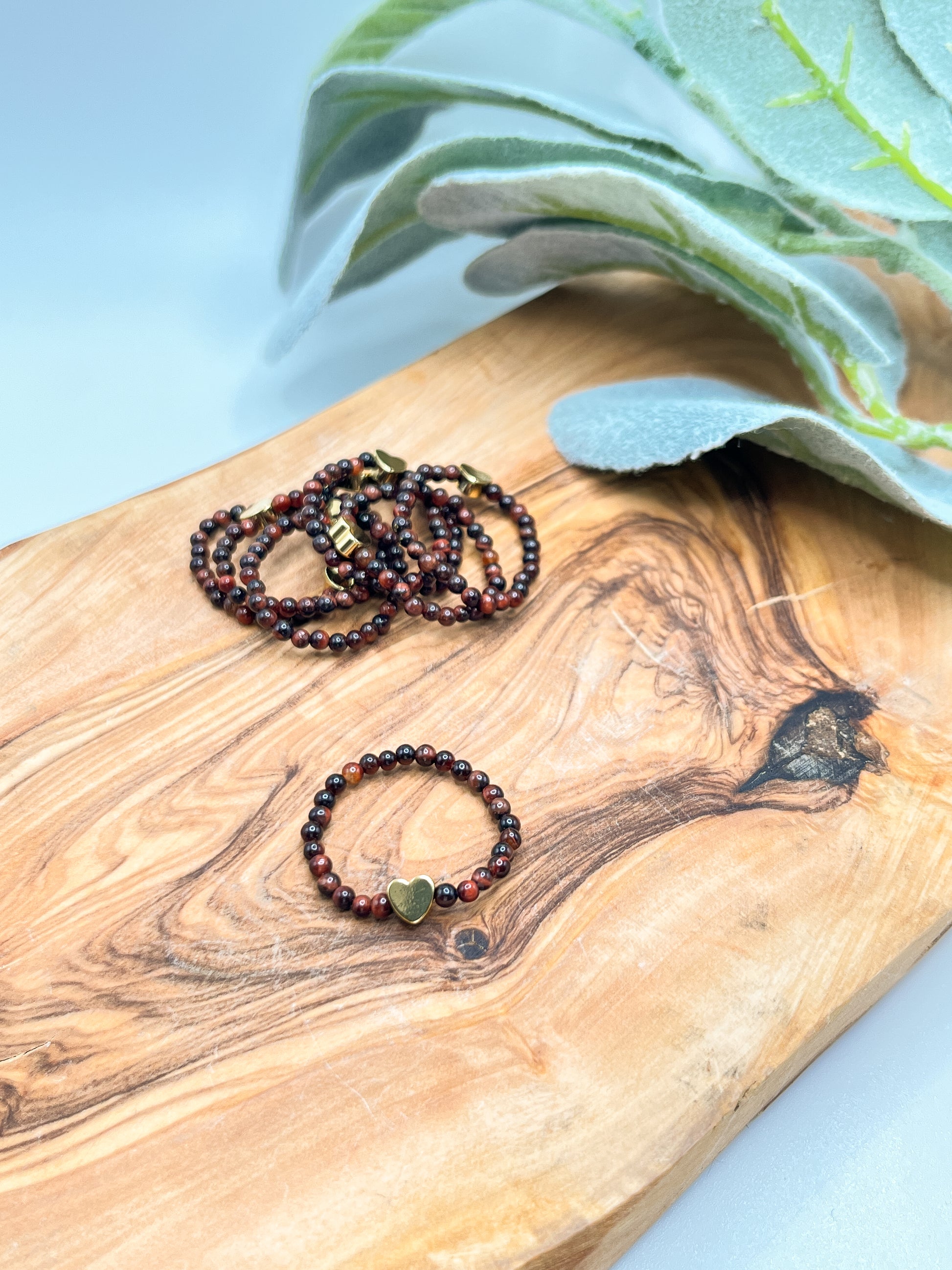 Red Tiger Eye - Crystal Round Beaded Ring w/ Gold Heart Bead